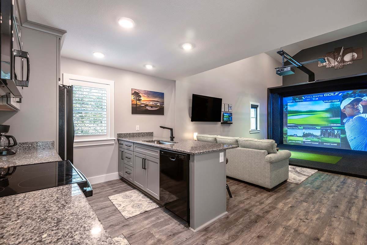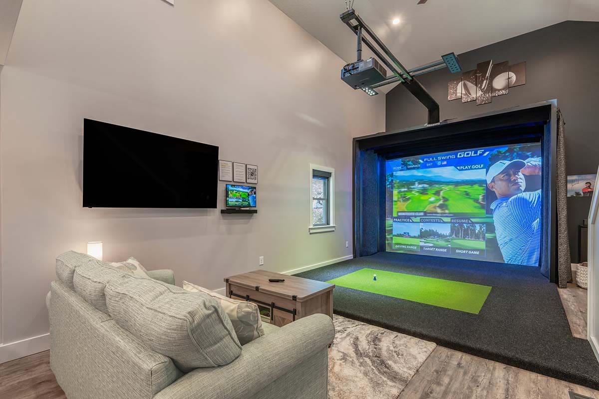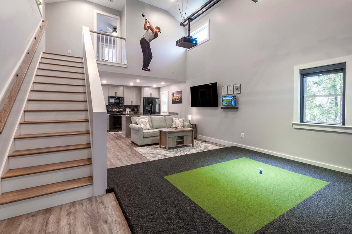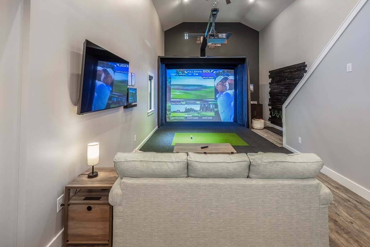The entire home is available with overnight rentals only. Hourly golf simulator rentals are welcomed to the kitchen, downstairs bathrooms, and living room.